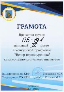 6 ноября 2019 г. в СДК БГТУ им. В.Г. Шухова состоялось посвящение в студенты первокурсников Химико-технологического института. Вечер прошел под тематикой «Путешественник во времени».