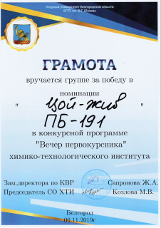 Студенты кафедры ЗЧС группа ПБ-191 по итогам конкурса заняли почетное 2 место, совсем немного уступив в борьбе за победу. Также группа была награждена за победу в номинации «Цой-жив!».